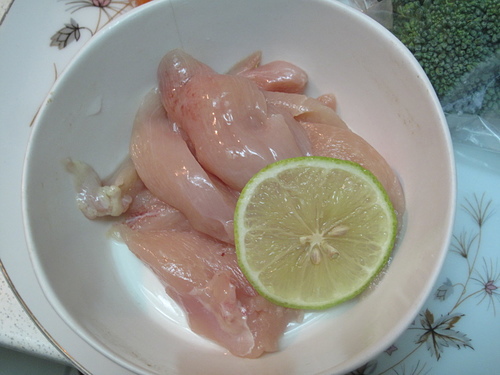 調味料:醃肉料>1/4小匙鹽.二匙太白粉.1/4小匙白胡椒.1/4柠檬汁.1大匙水.1大匙料酒
