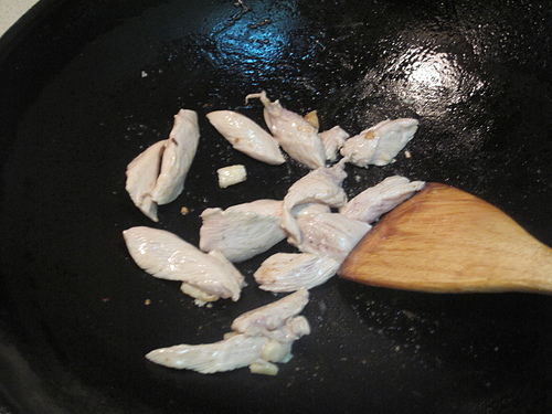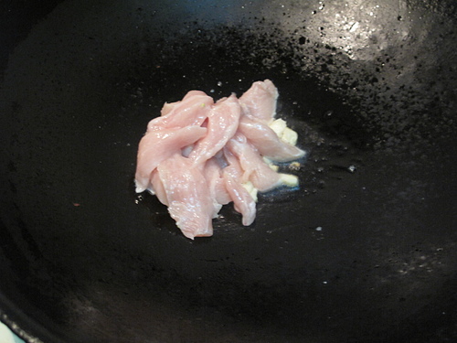 2.鍋中熱大匙油.放人雞肉片稍炒至八分熟.鏟出
