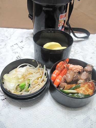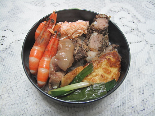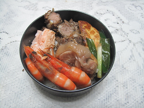 今日菜色..炒甜蝦..烤鮭魚..醉雞腿..鹹豬肉..紅燒豆腐