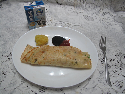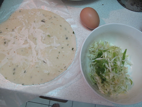 備料:蛋餅皮一張..蛋一顆..高麗菜絲.葱絲..