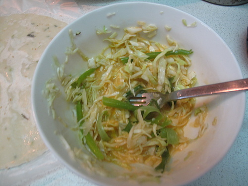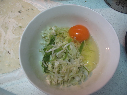 先將高麗菜絲.葱絲與蛋攪拌備用