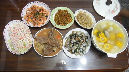 海裡的~陸上的~全部都有哩~^^人多才能煮那麼多哩~^^而且全部吃光光喲~