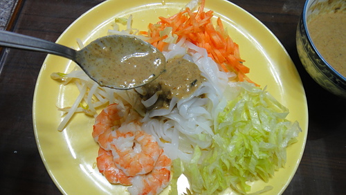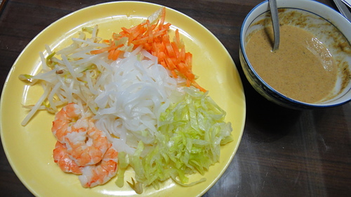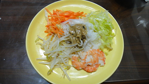 材料:蒟蒻麵1包..豆芽絲..紅蘿蔔絲..生菜絲..甜蝦~適量