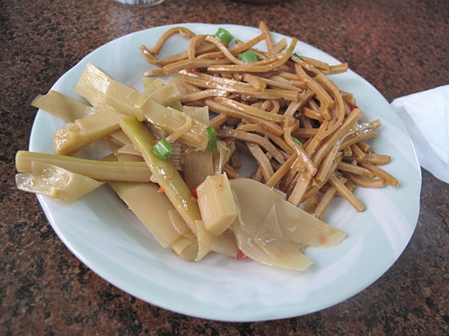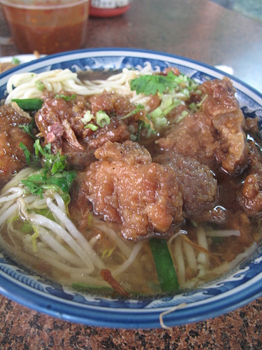 搭著清爽豆芽菜香菜~~淋上香味四溢黑醋~再一匙辣椒醬~
