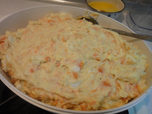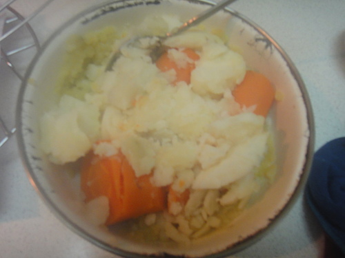 都好了喲~~趁熱可以壓成泥~~因為寶貝不愛地瓜~~我壓成地瓜泥~~跟馬鈴薯混在一起~