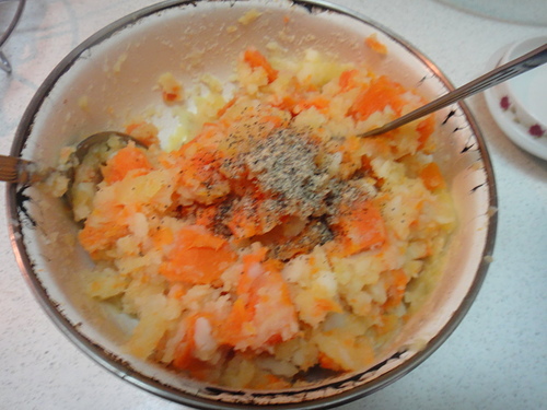 放一些黑白胡椒提味 ~我不會再放鹽~~我喜歡這種薯泥沙拉的原味哩~