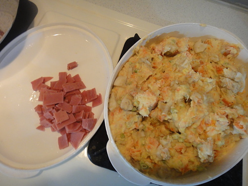 今天老爺的好同學要來台中玩~~她家少爺愛火腿~~我又特別加進火腿~~口感又更豐富了哩~~