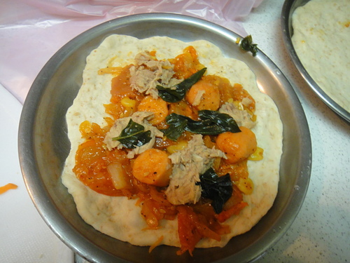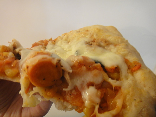 熱狗,火腿,紅蘿蔔絲,白蘿蔔絲,比薩起士絲,義大利蕃茄麵醬..洋葱.玉米..鮪魚,黑胡椒,