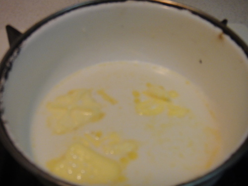 1.無鹽奶油+牛奶+細砂糖放入盆中煮沸