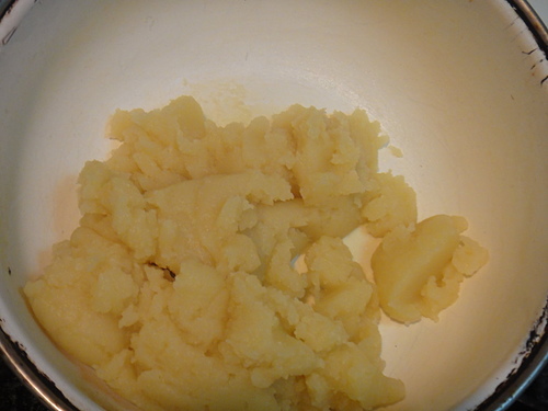 4.稍微放涼一些,將雞蛋液加一些到麵團中用木匙攪拌均勻