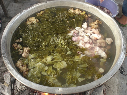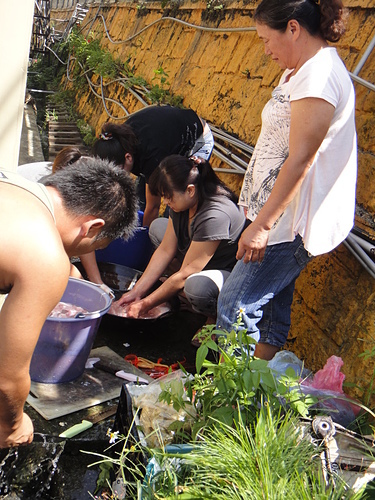豬來了~來參加的親戚全員動起來~~男人聊天介紹彼此~女人就洗豬的內臟~~準備煮成