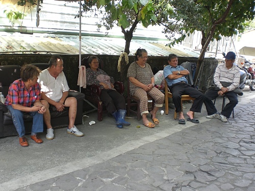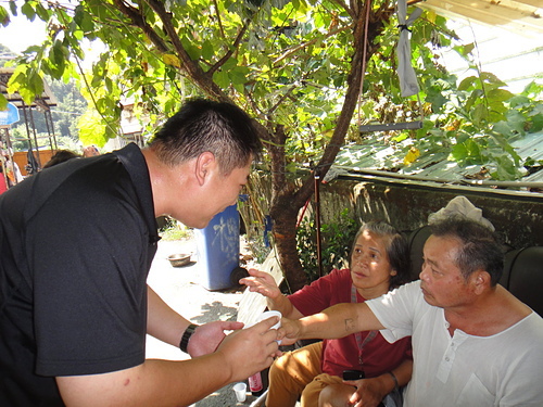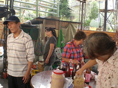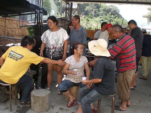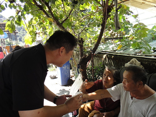 村長介紹我跟二妹一家人給舅舅的親戚認識~~旁邊的舅媽幫著拿出自己最拿手的醃豬肉