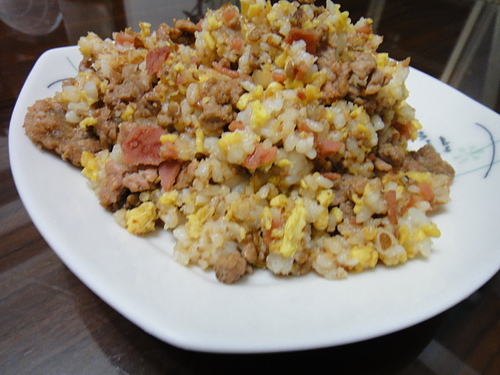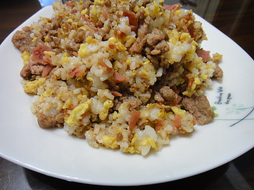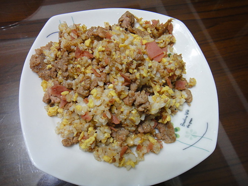 剩不到二碗飯..加蛋.肉片切小塊..火腿..變成二個人吃剛剛好呢~