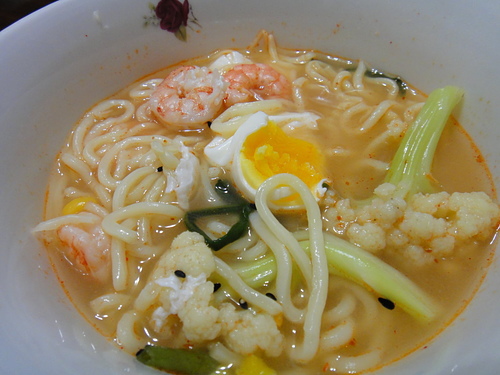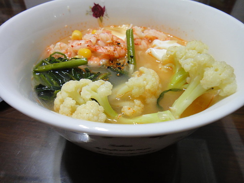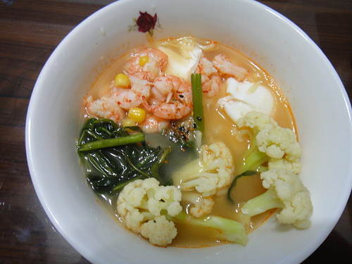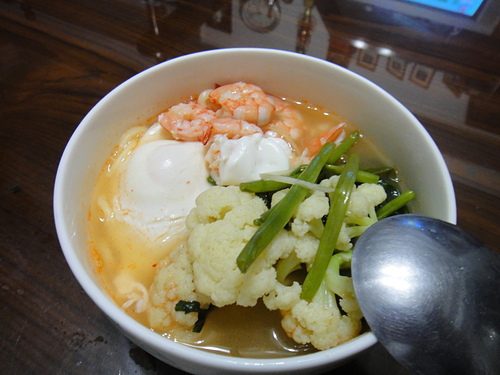 簡單吃晚餐..妹夫送來蝦子換新招..來做鮮蝦麵..雞高湯+鮮蝦頭熬湯..加一個蛋.玉米粒.空心菜.白花菜