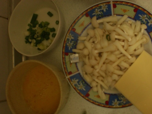 材料:起士一片((寶貝說起士要再多一片~味道會更好~))..葱花少許..雞粉少許..蛋三顆..美白菇