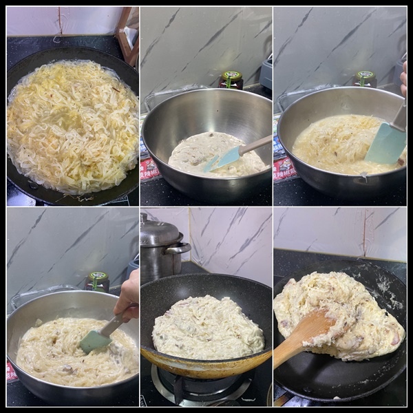 ④翻炒蘿蔔絲並加入鹽、糖、胡椒、煮香腸留下的高湯煮滾,倒入麵糊中