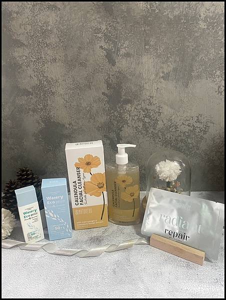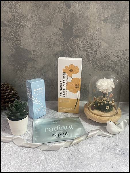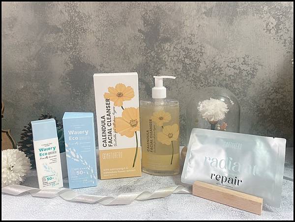 金盞花舒緩洗卸凝露、海洋友善水感防曬乳 SPF50+ 和 肌光淨白面膜