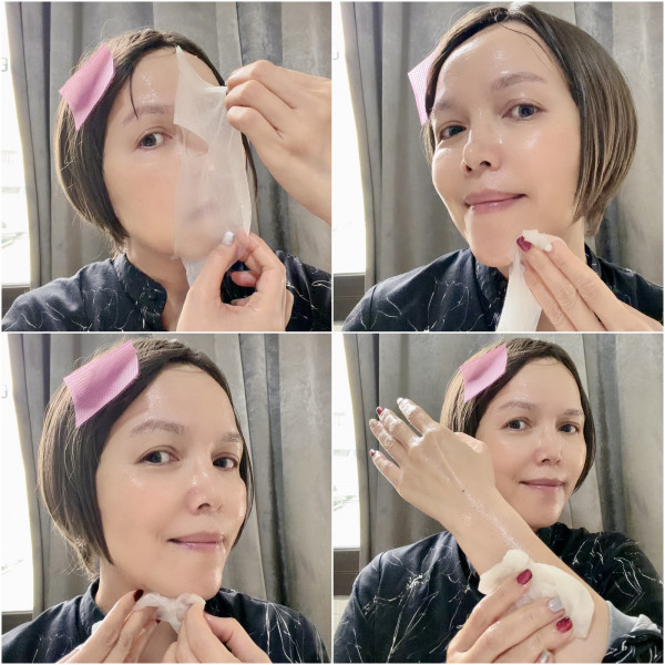 如果天氣很乾或者在冷氣房裡,感覺面膜開始稍微乾掉了,就可以先把它拿下來